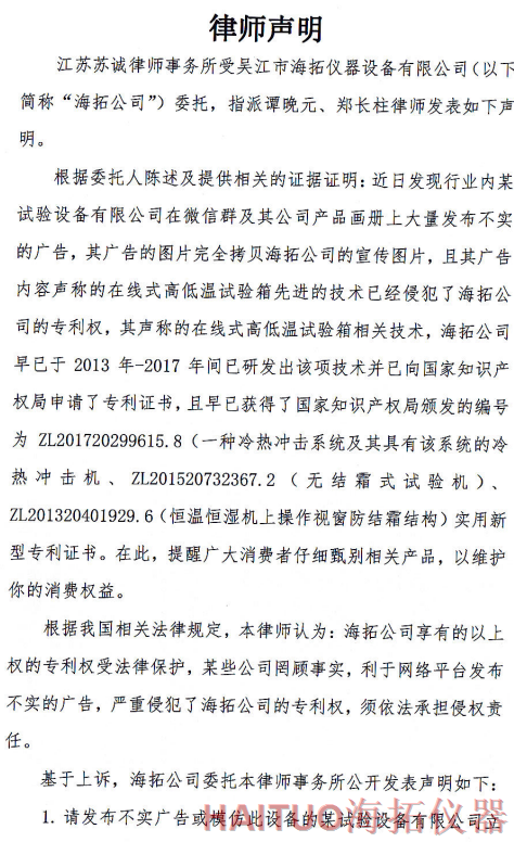 海拓儀器律師聲明:反對侵權(quán)行為 維護(hù)公司和消費(fèi)者權(quán)益摘要:國內(nèi)試驗(yàn)設(shè)備領(lǐng)先者吳江市海拓儀器設(shè)備有限公司委托律師事務(wù)所發(fā)布了律師聲明,該聲明指出,當(dāng)前市面上出現(xiàn)了產(chǎn)品專利侵犯海拓儀器權(quán)益,海拓儀器將以法律手段維護(hù)自身利益。該律師聲明要求某試驗(yàn)設(shè)備有限公司立即停止侵權(quán)行為,扯下其在網(wǎng)絡(luò)平臺的相關(guān)廣告和宣傳畫冊并同時(shí)停止生產(chǎn)同款設(shè)備。如果該設(shè)備公司不聽勸解,海拓儀器將向人民法院依法起訴該公司侵權(quán)行為,以維護(hù)自身合法權(quán)益和維護(hù)客戶消費(fèi)權(quán)益,并建議廣大消費(fèi)者仔細(xì)甄別相關(guān)產(chǎn)品。? ? ? ?近日,吳江市海拓儀器設(shè)備有限公司委托律師事務(wù)所發(fā)布了律師聲明,該聲明指出,當(dāng)前市面上出現(xiàn)了產(chǎn)品專利侵犯海拓儀器權(quán)益,海拓儀器將以法律手段維護(hù)自身利益。??事件源起于海拓儀器發(fā)現(xiàn)市面上有同類設(shè)備公司通過完全拷貝海拓儀器產(chǎn)品宣傳圖片,在微信群及該公司產(chǎn)品畫冊上大量發(fā)布不實(shí)廣告。??聲明指出,該廣告聲稱的在線式高低溫試驗(yàn)箱的技術(shù)侵犯了海拓儀器的專利權(quán),該產(chǎn)品專利由海拓儀器 -